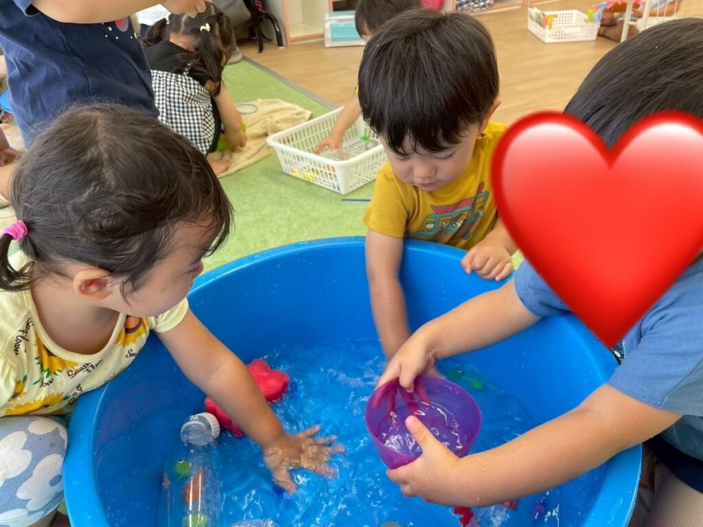 水を豪快に汲んで、となりのバケツにジャバーと移したり、ゴム人形の金魚や恐竜をすくって遊びました。