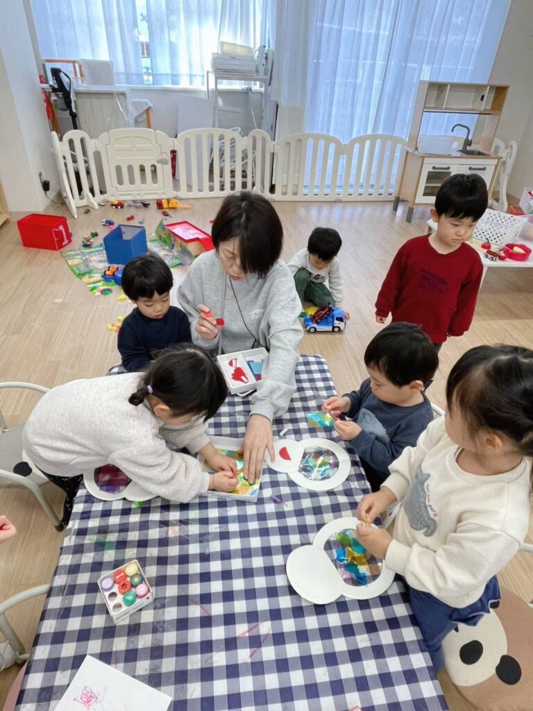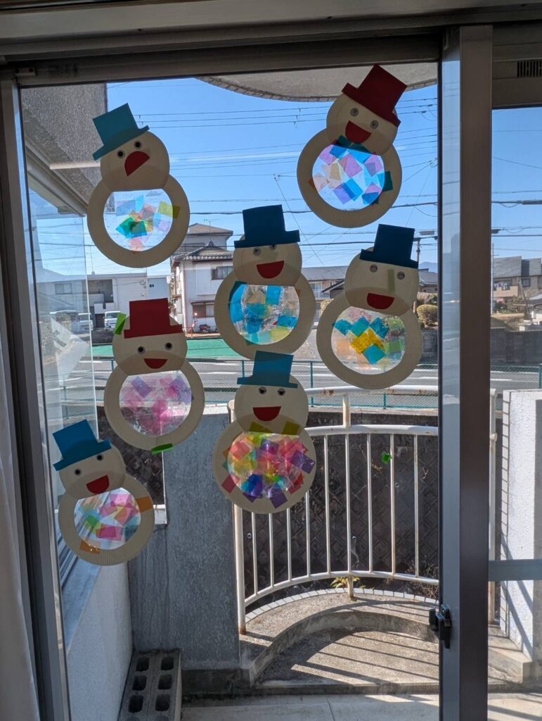 出来上がった雪だるまを窓に貼ると、「きれいだね!」とにこにこ笑顔の子どもたちでした。