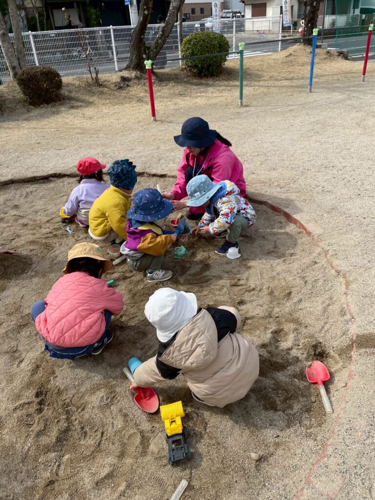他園の少し大きいお友だちも来ていて、少し交流しながら遊ぶ姿もありました。