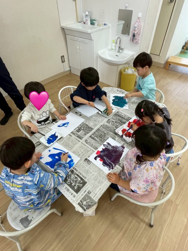 昼食後は筆を使って絵の具遊びをしました。