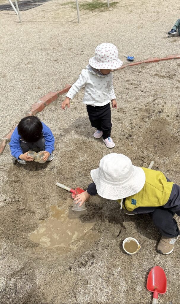 砂場を覗くと、水たまりが!水をすくってカップに入れては、また穴に入れ、泥んこ遊びになりました。