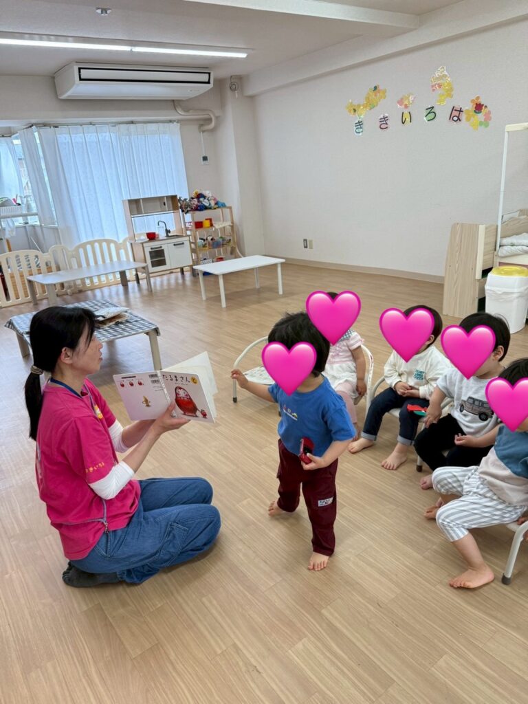 朝は、ひとりひとりが安心して過ごせるように、寂しい気持ちを受け止めて抱っこをしたり、絵本を一緒に読んだり、車やままごとで遊んだり、ゆったりと過ごしました。