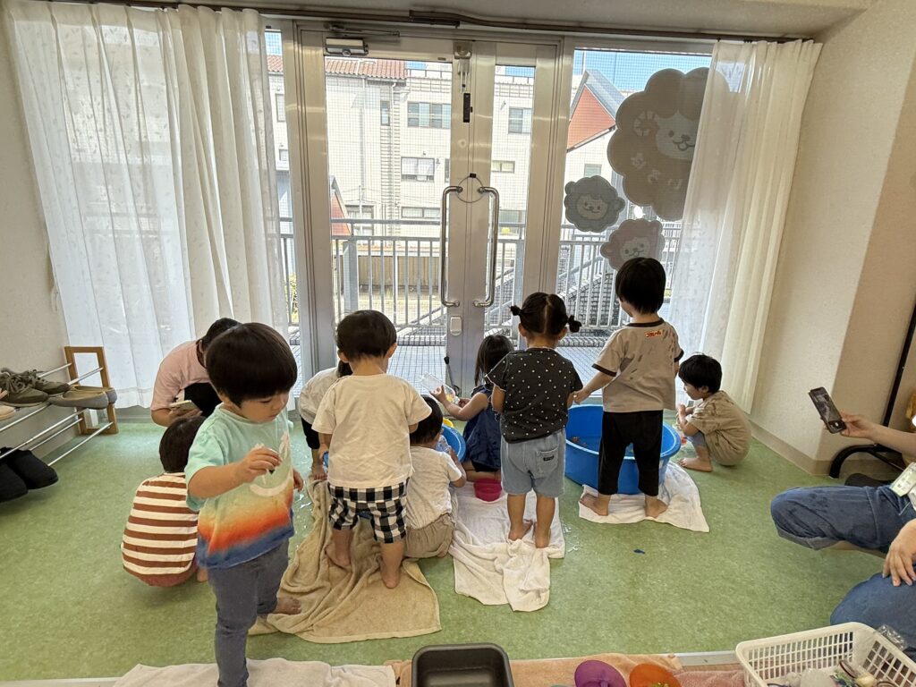 まだまだ暑い日が続くので、たらいに水をはって水遊びを楽しみました。金魚をすくったり水風船の感触を楽しんでいました。だんだん遊びも大胆になり水しぶきが‥とても盛り上がっていました!