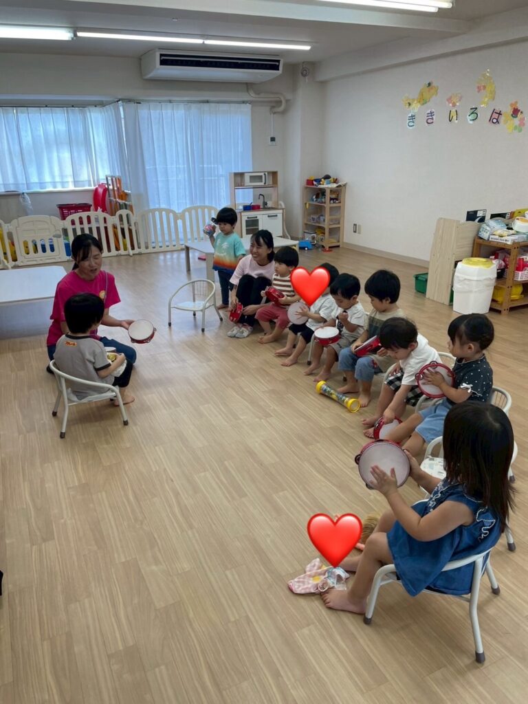 朝の会では♪やまのおんがくか♪どんぐりころころのうたに合わせてタンバリンを叩いてあそびました。