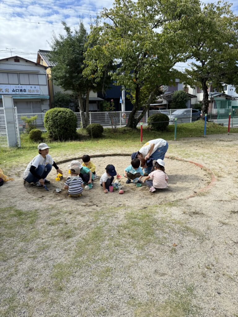 カップに砂を入れてプリンやケーキに見立てたりシショベルカーのおもちゃに砂を入れて運んだりと、じっくり遊びました。