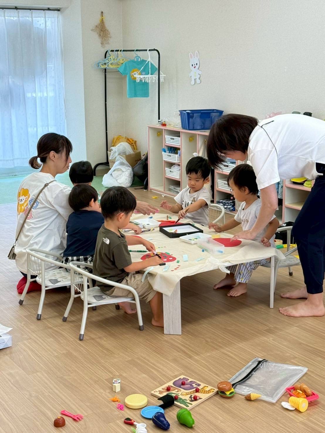朝、涙を見せたお友だちも、先生の膝で安心したり、お気に入りのおもちゃを見つけて遊びはじめたりして、笑顔になってくれました...