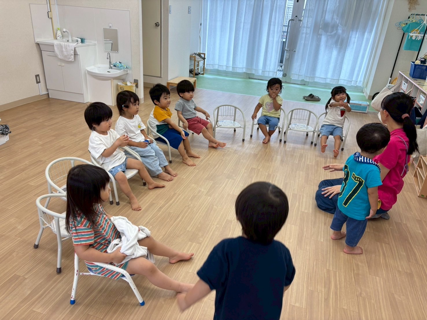 雨が降ったり止んだり、蒸し暑い1日でしたが、室内で水遊びやリトミックをして過ごしました🎶 朝の集まりは、...